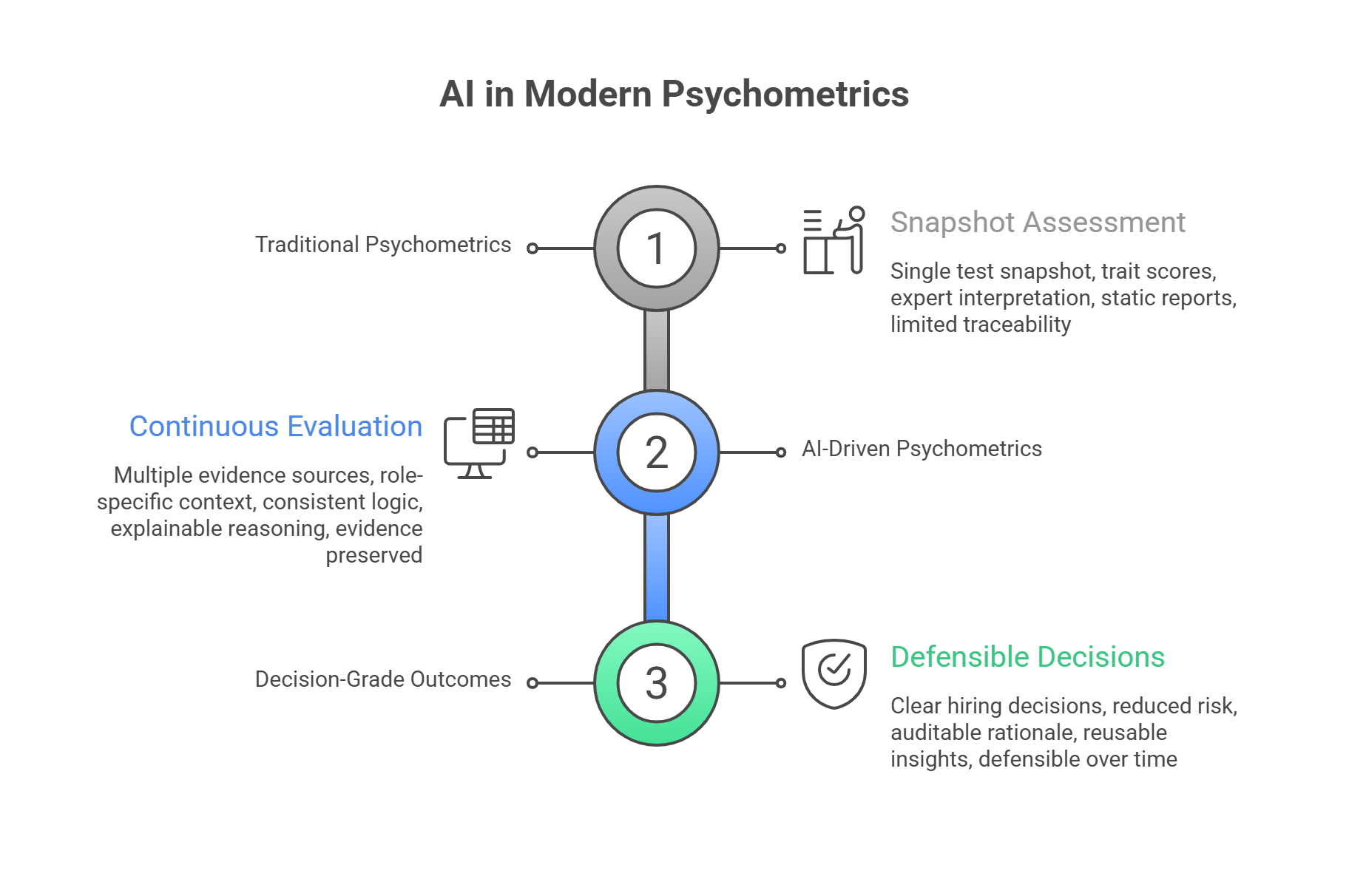 Traditional psychometrics focus on test scores. Modern AI-powered psychometrics focus on evidence, reasoning, and decisions that can be explained, reviewed, and defended over time.