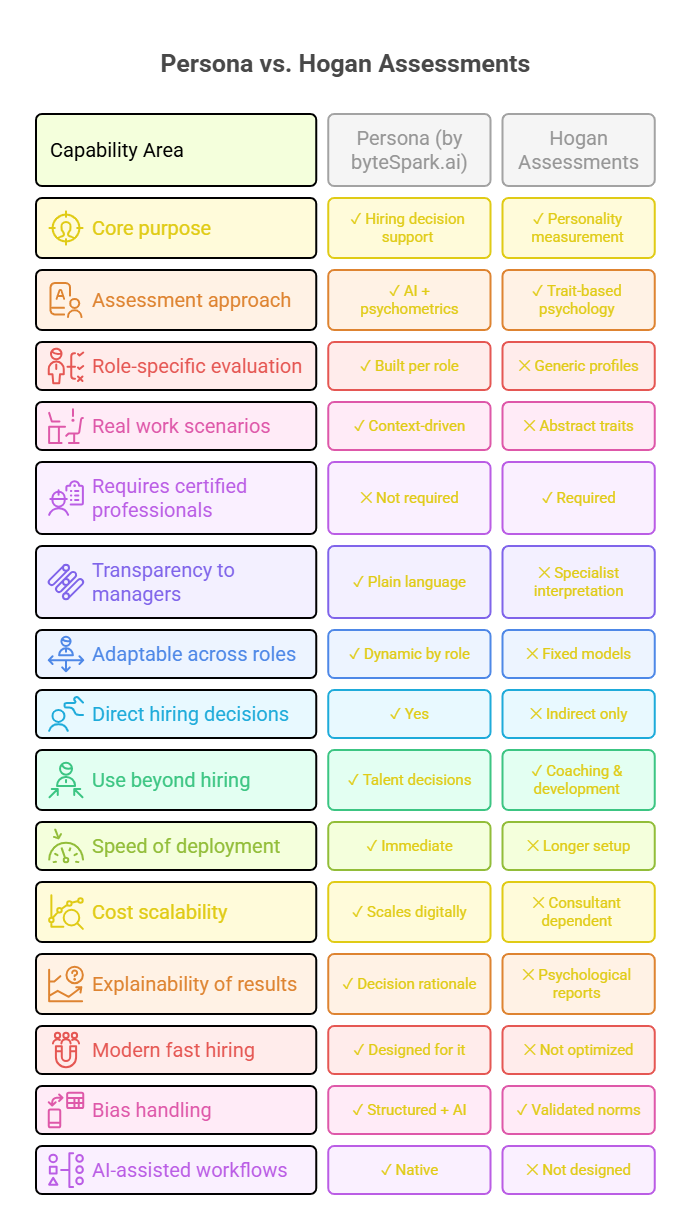 A clear comparison of Persona and Hogan, explaining how modern AI driven psychometrics differ from traditional personality assessments when making hiring and talent decisions.