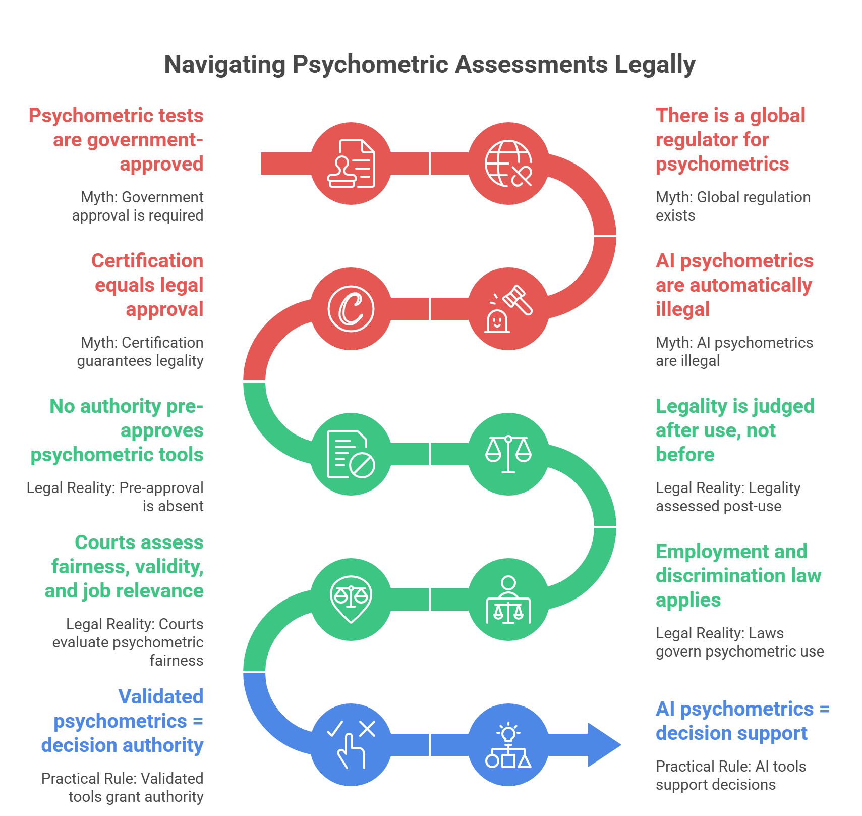 Psychometric assessments are not government-approved or pre-regulated. Learn how legality actually works and what employers must defend if challenged.
