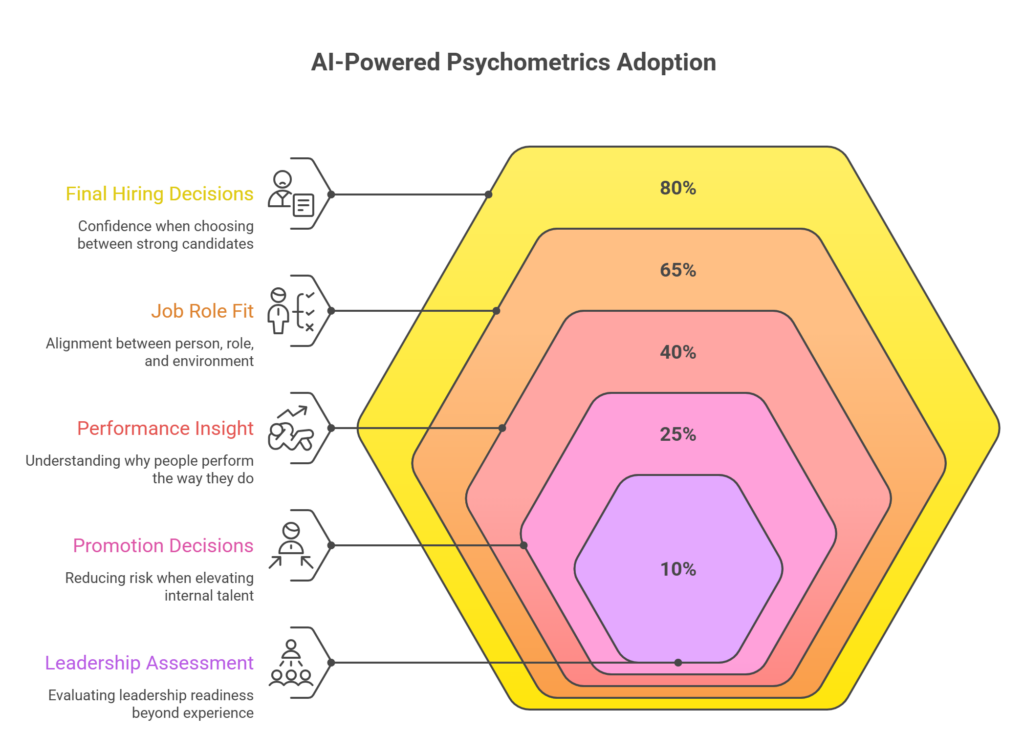 Today, organizations are applying AI-powered psychometrics across multiple people decisions, not just hiring. The value is not theoretical. It shows up clearly in how teams reduce risk, improve alignment, and make better decisions when stakes are high.