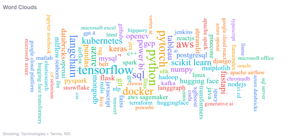 The accompanying technology word cloud highlights the most in-demand tools and platforms among candidates applying for AI Specialist roles. Core programming languages like Python, SQL, and JavaScript dominate the landscape, alongside key frameworks such as TensorFlow, PyTorch, scikit-learn, and LangChain. Cloud infrastructure expertise (e.g., AWS, GCP, Azure) remains essential, while tools like Docker, Kubernetes, Hugging Face, and MLflow signal strong demand for scalable, production-grade AI solutions. This blend of MLOps, deep learning, and LLM tooling reflects the evolving full-stack nature of modern AI engineering roles.