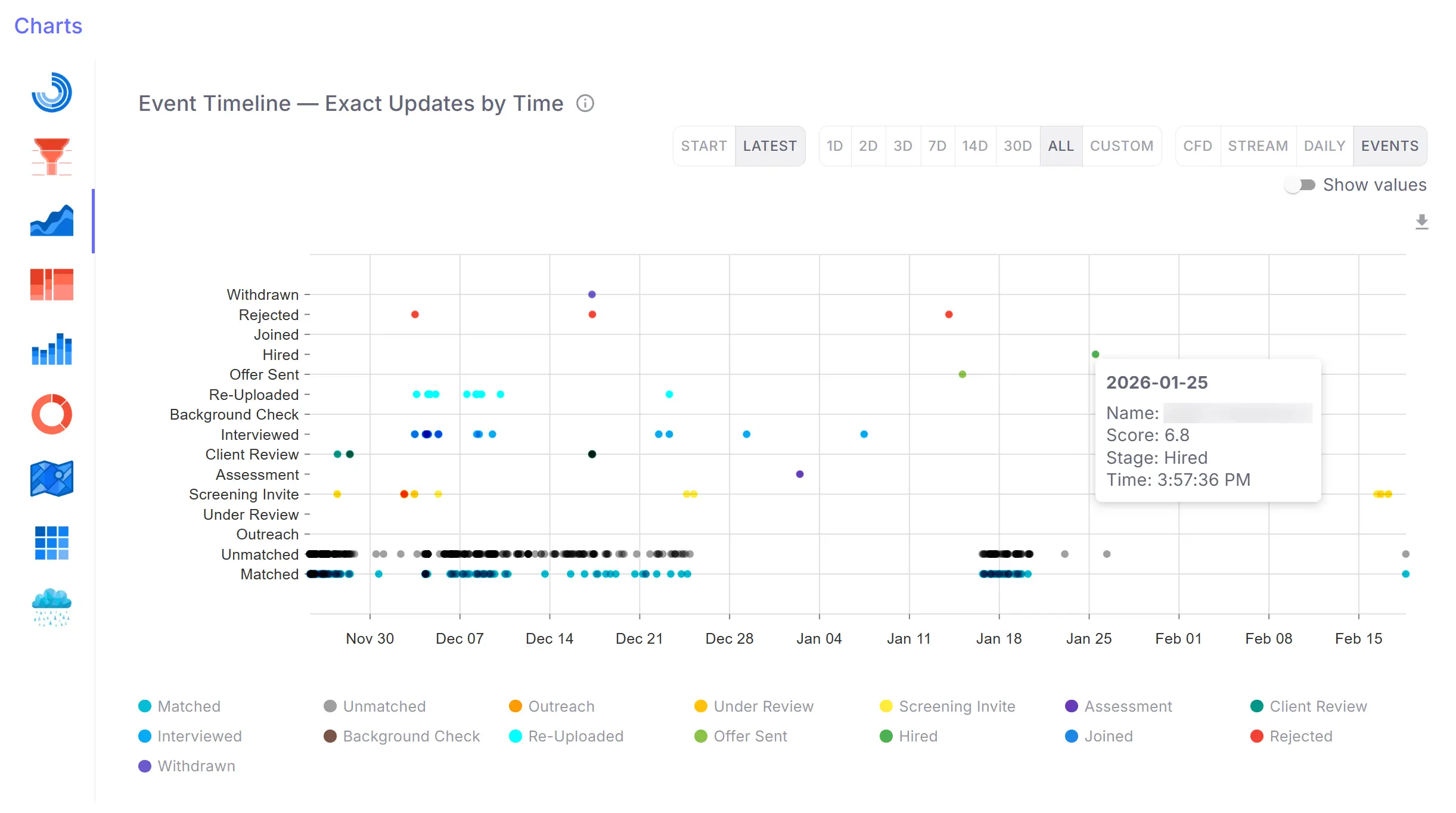 Senior hiring often fails gradually: delayed feedback, unclear ownership, and long stage gaps. A visual pipeline timeline allows CHROs to see where decision latency appears and where top talent disengagement risk increases.