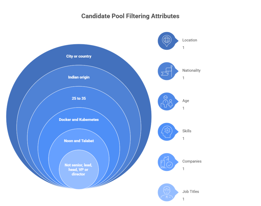 Our discussions with recruitment leads since 2022 has yielded one common baseline. Their ability to find a candidate is restricted to filtering based on a very limited number of attributes. The best list we have come across allows a recruiter to find candidates based on the following: