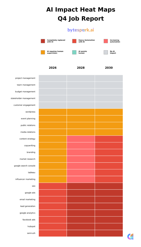 By 2030, our proprietary research at byteSpark.ai indicates that core project management competencies will experience zero AI displacement—not because the technology isn’t advancing, but because these skills represent the irreducibly human elements of organizational success.